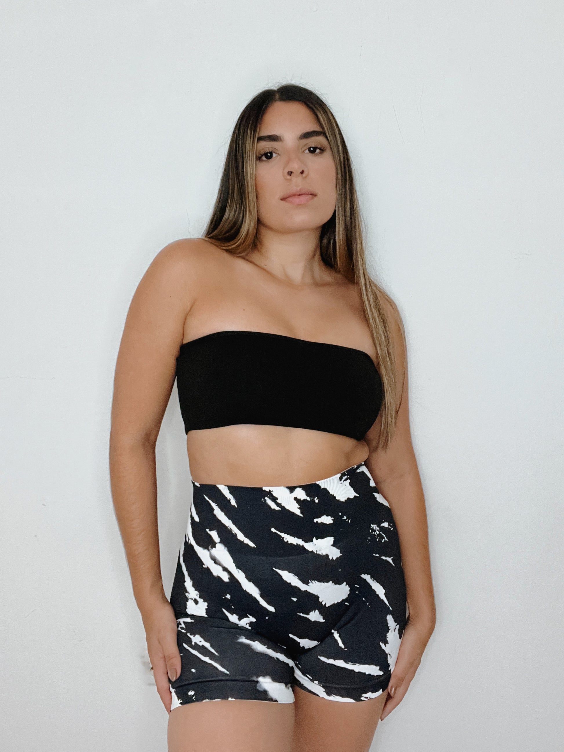Seamless print knitted high waist shorts.