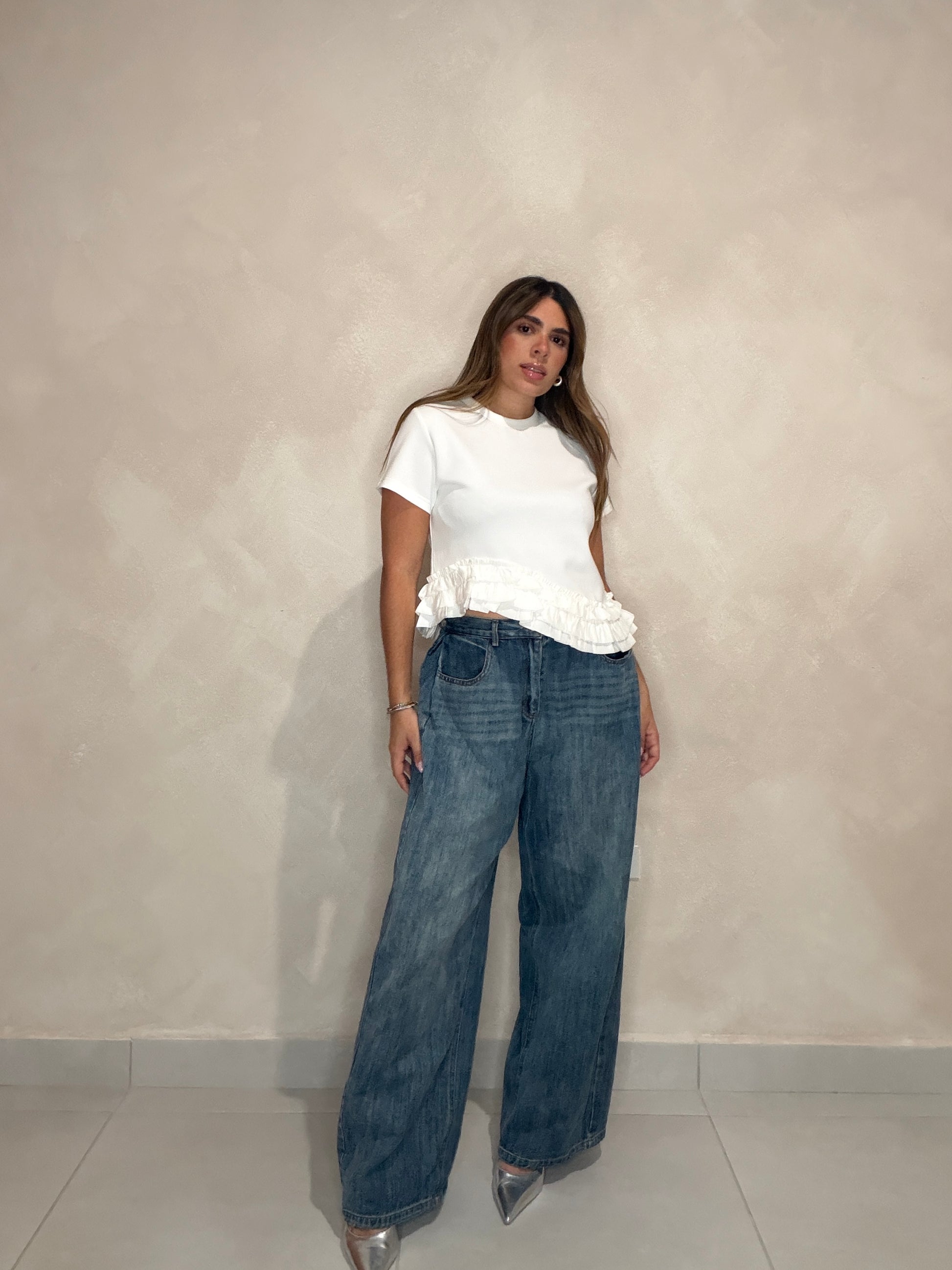 White asymmetric t shirt top.