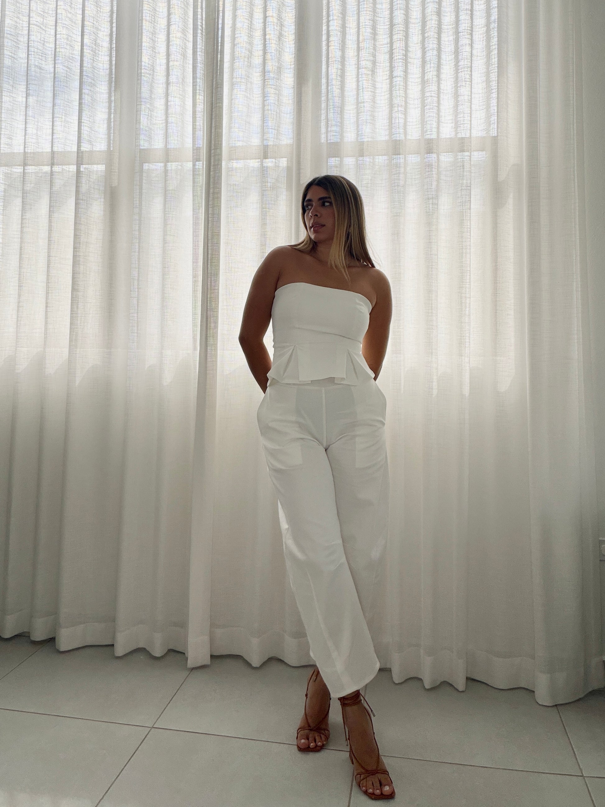 White pleated strapless peplum barrel jumpsuit.