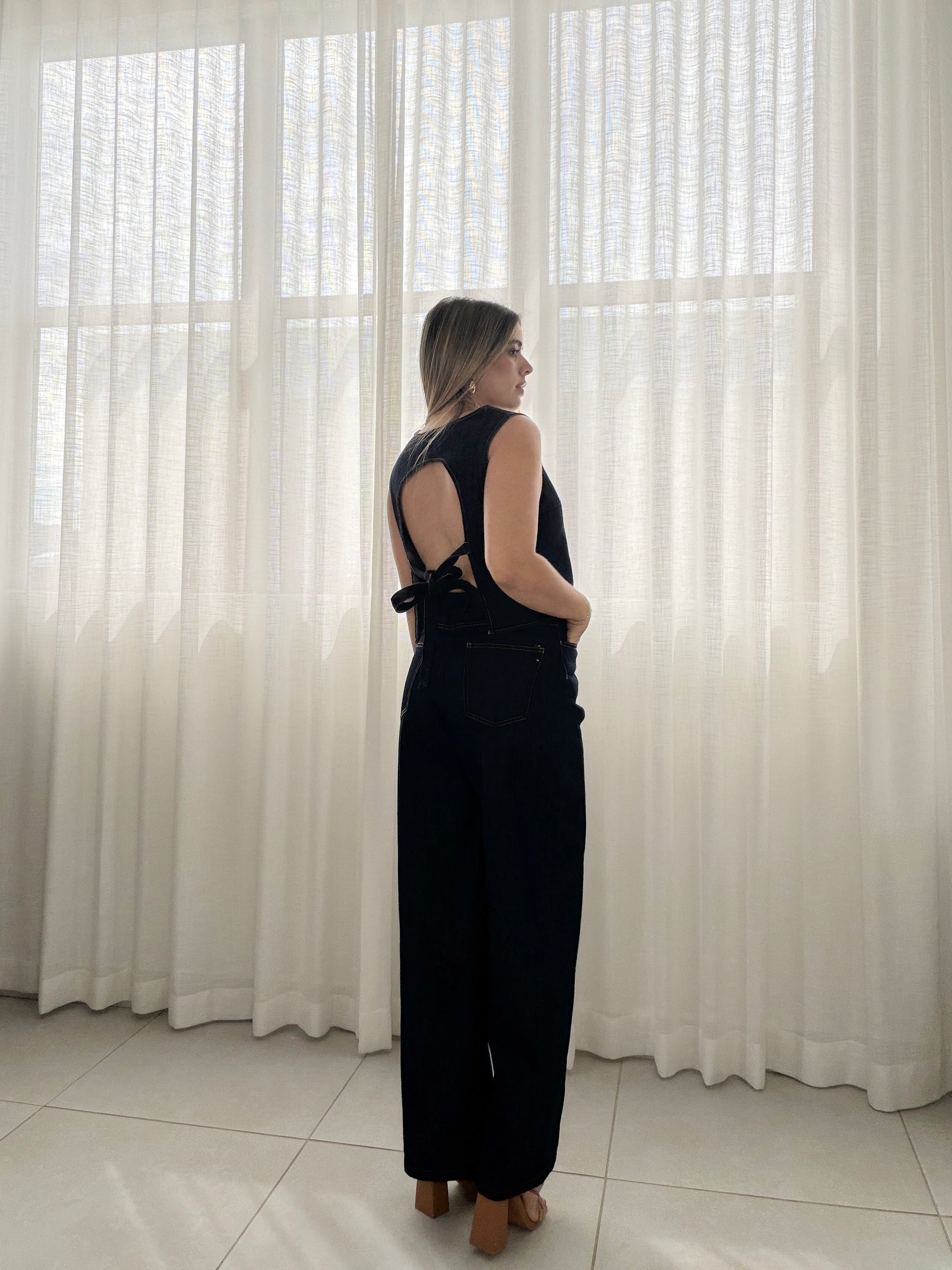 Denim sleeveless open back top and pants set.