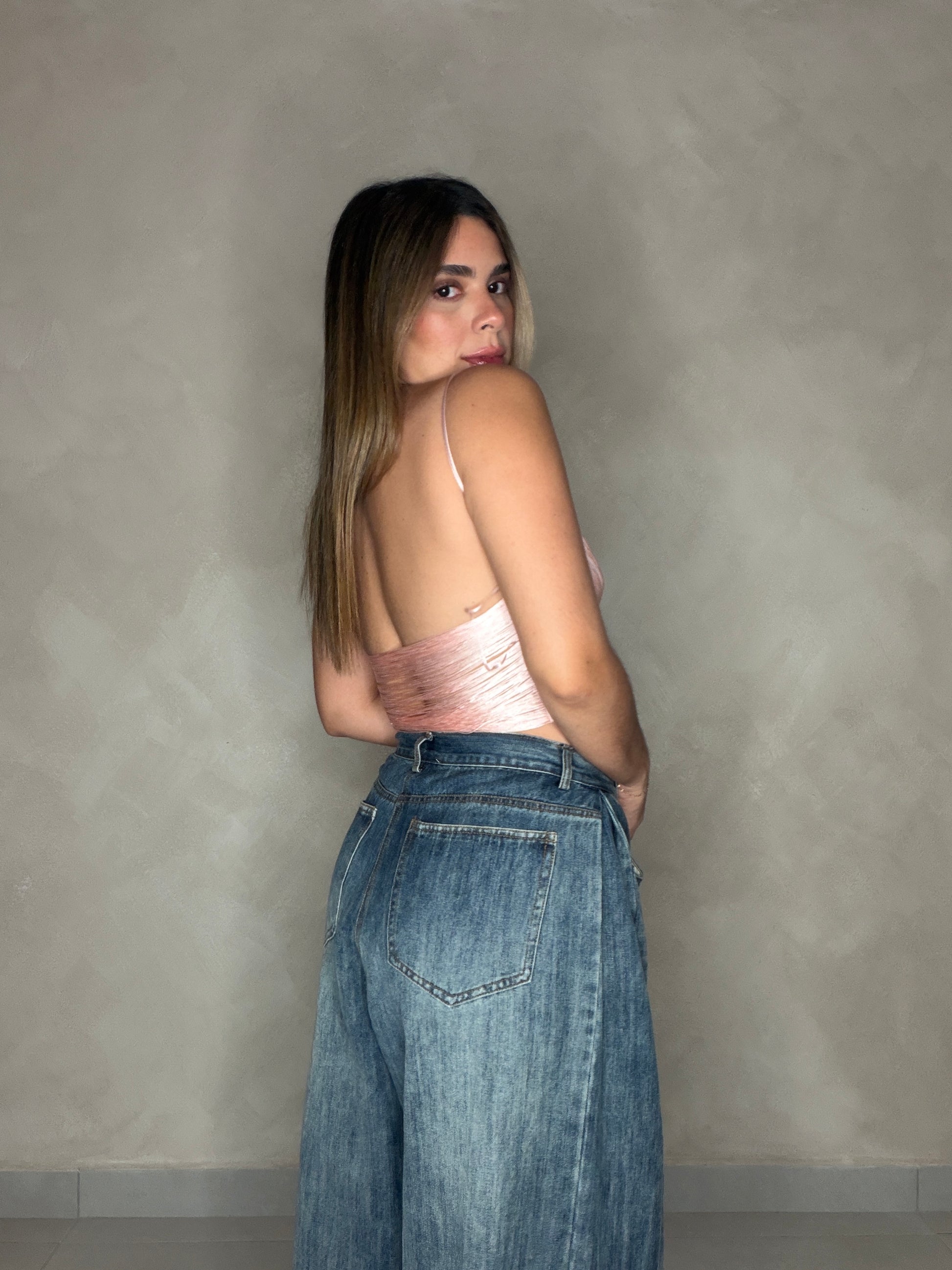 Pink fringe strap top.