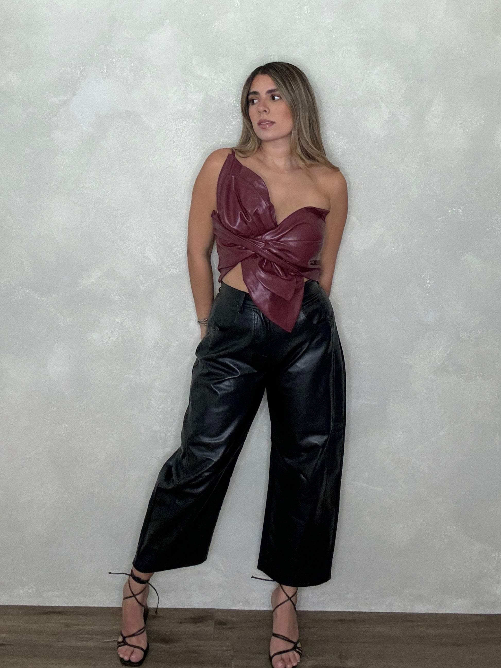 Black leather barrel pants.