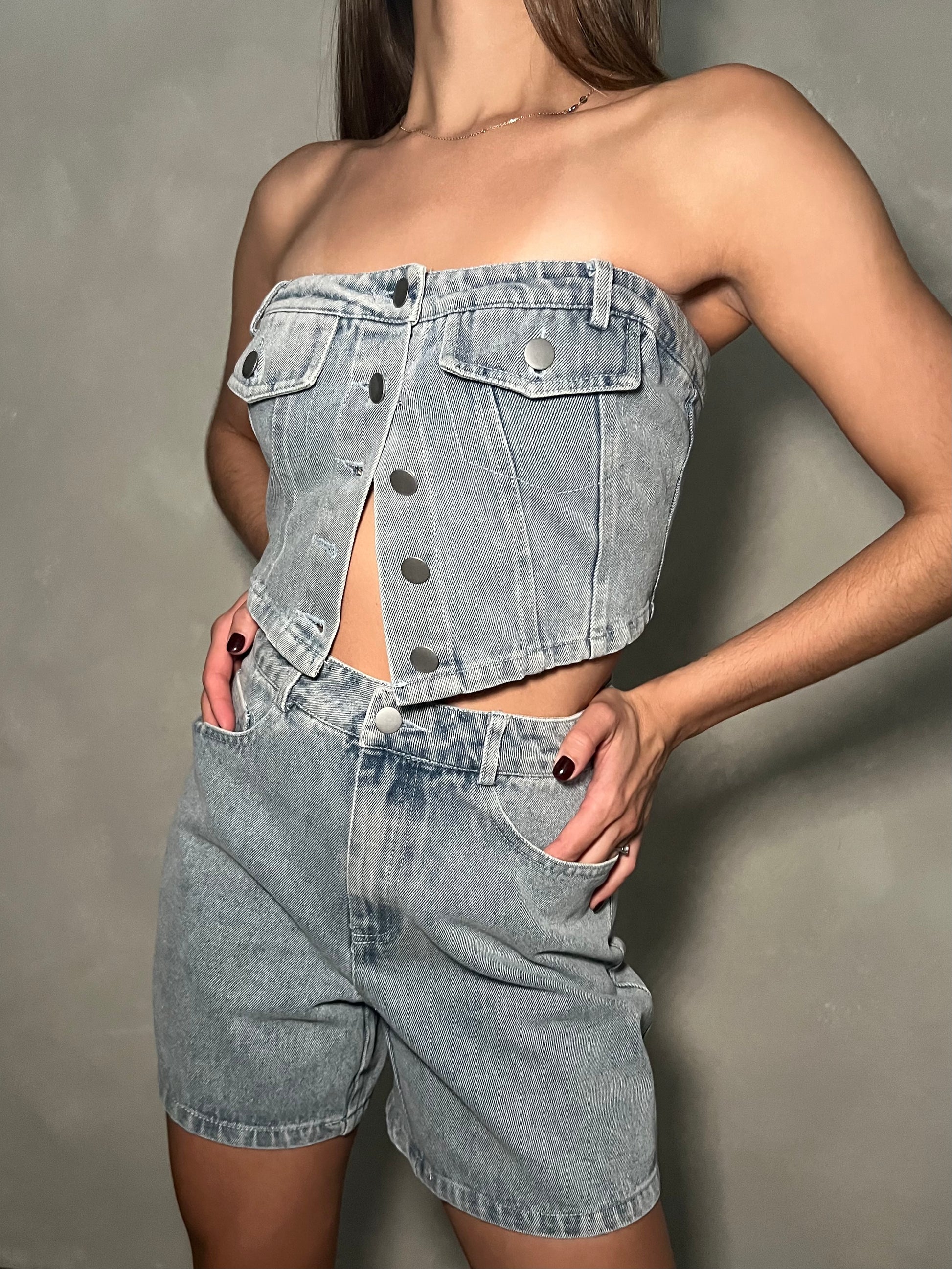 Light blue mid length denim shorts.