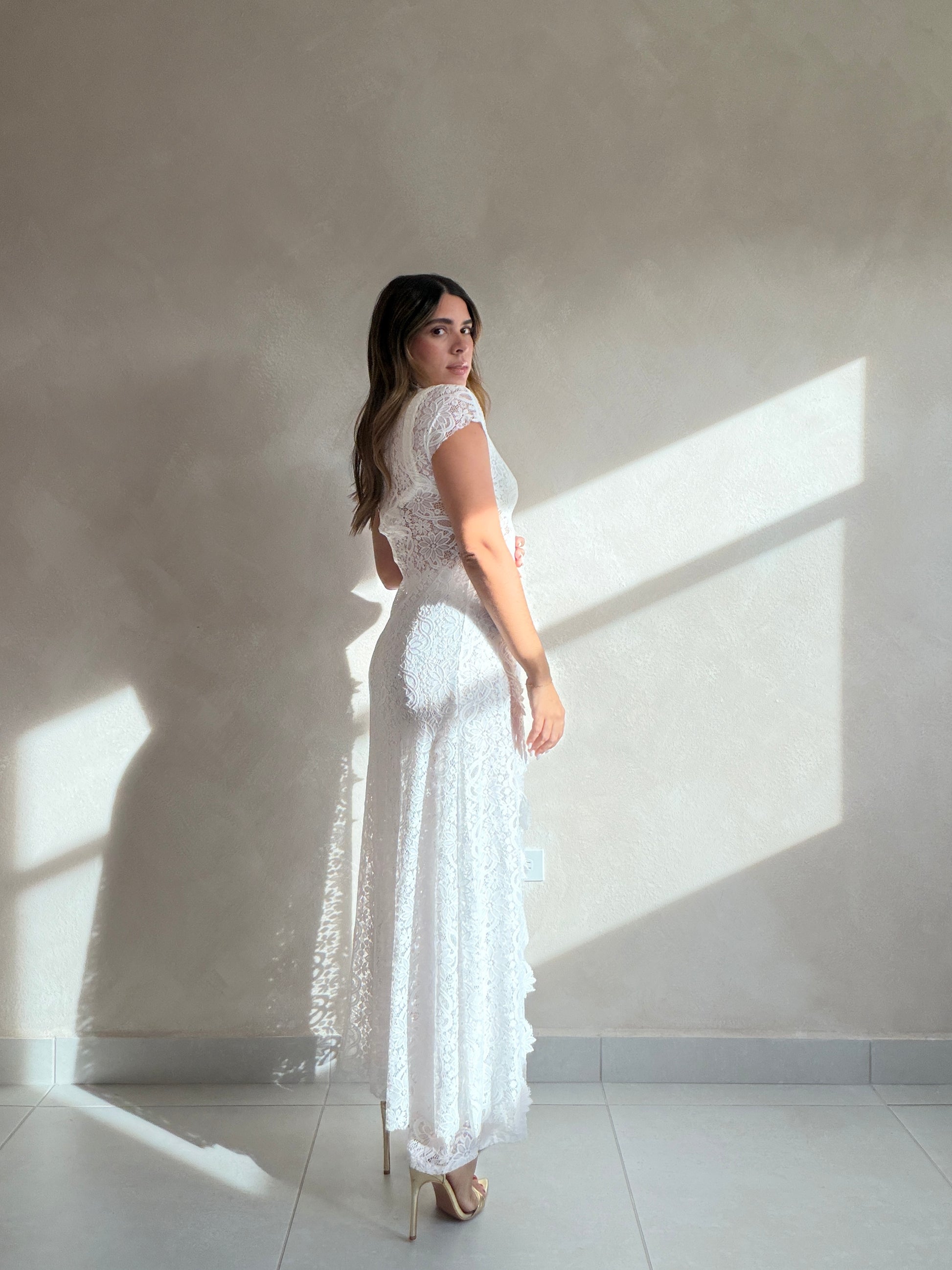 White lace long coat top and straight leg pants.