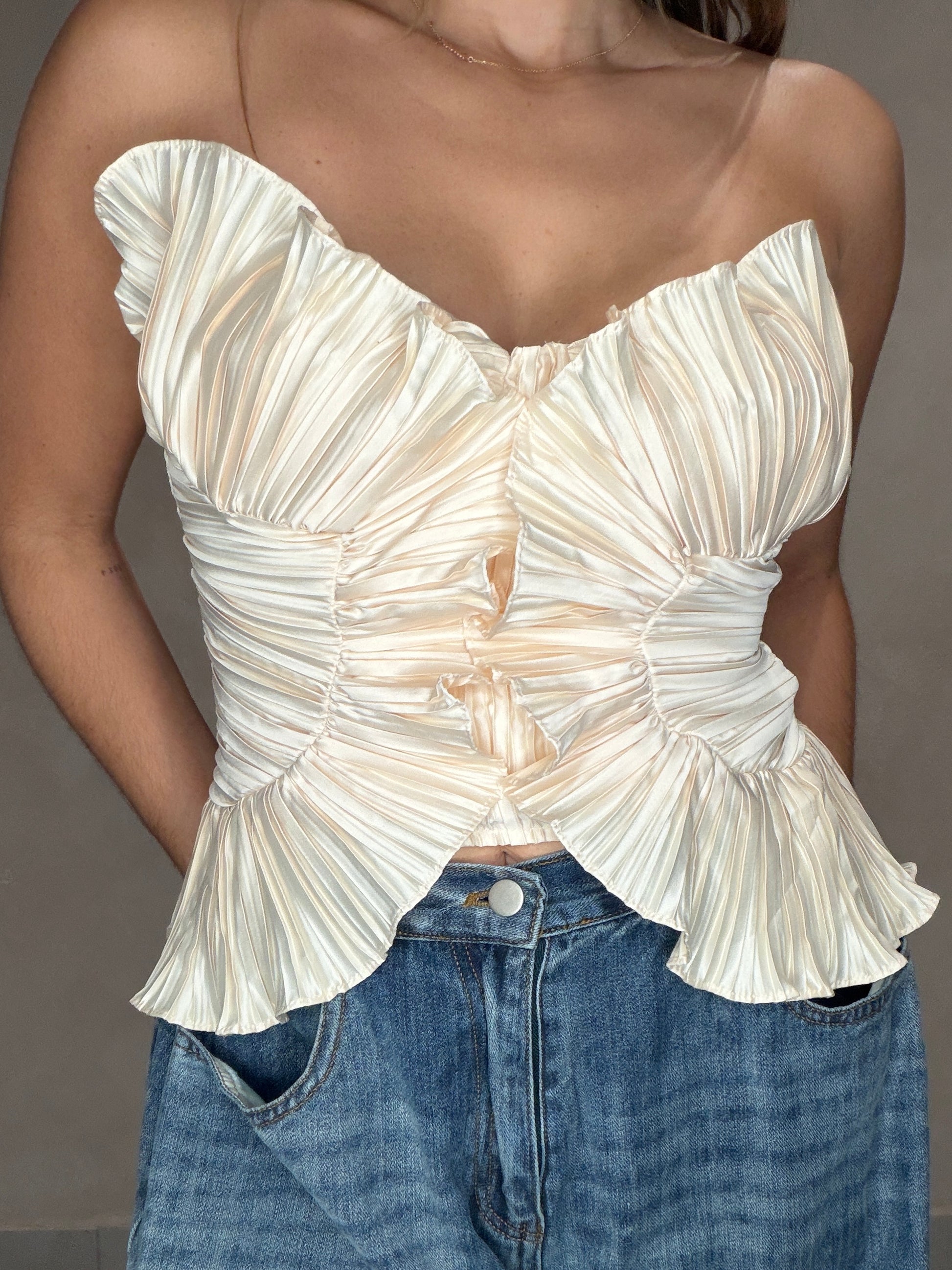 Champagne pleated ruffle top. Straps included