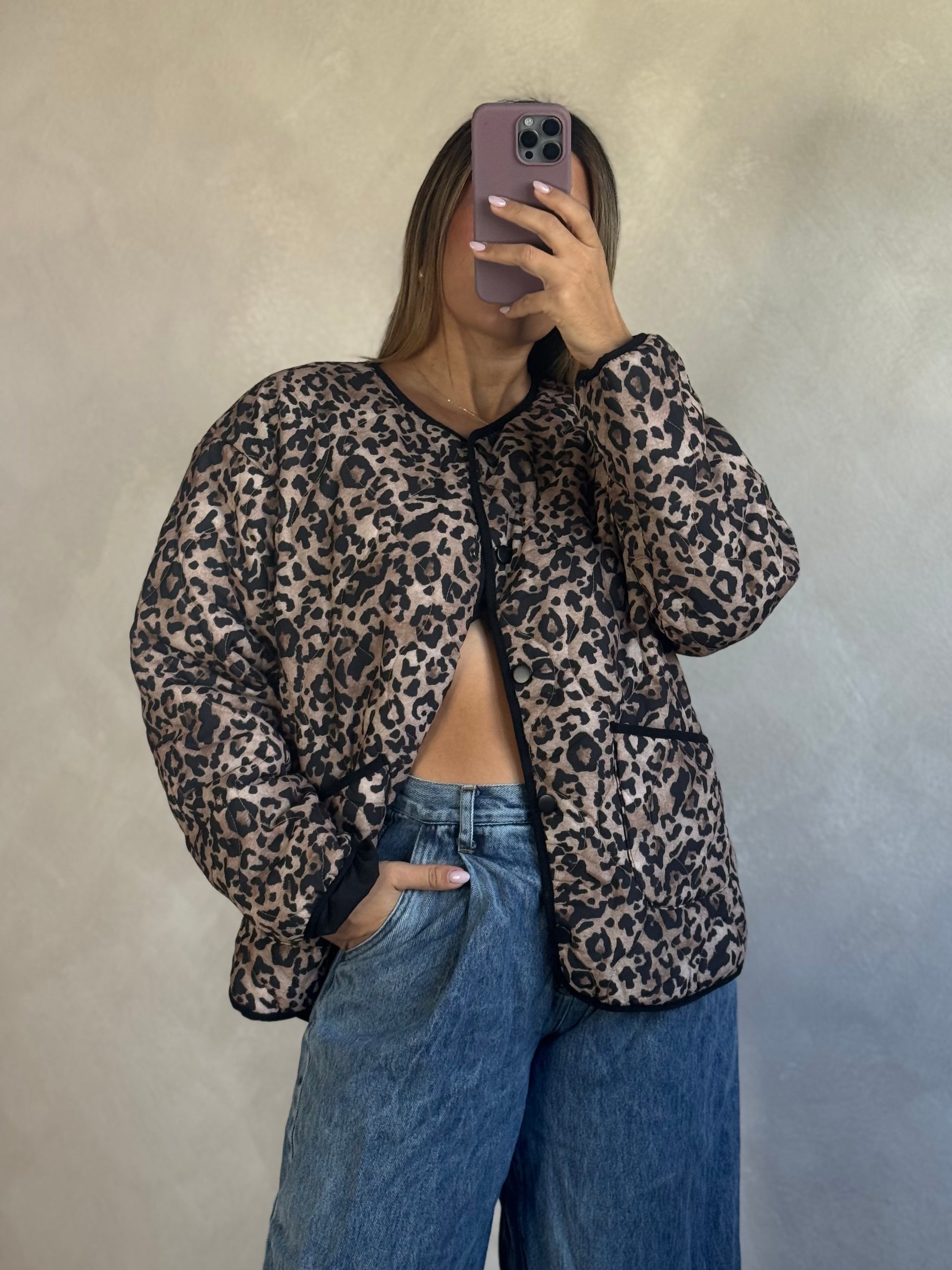Leopard print quilted snap jacket. Oversized